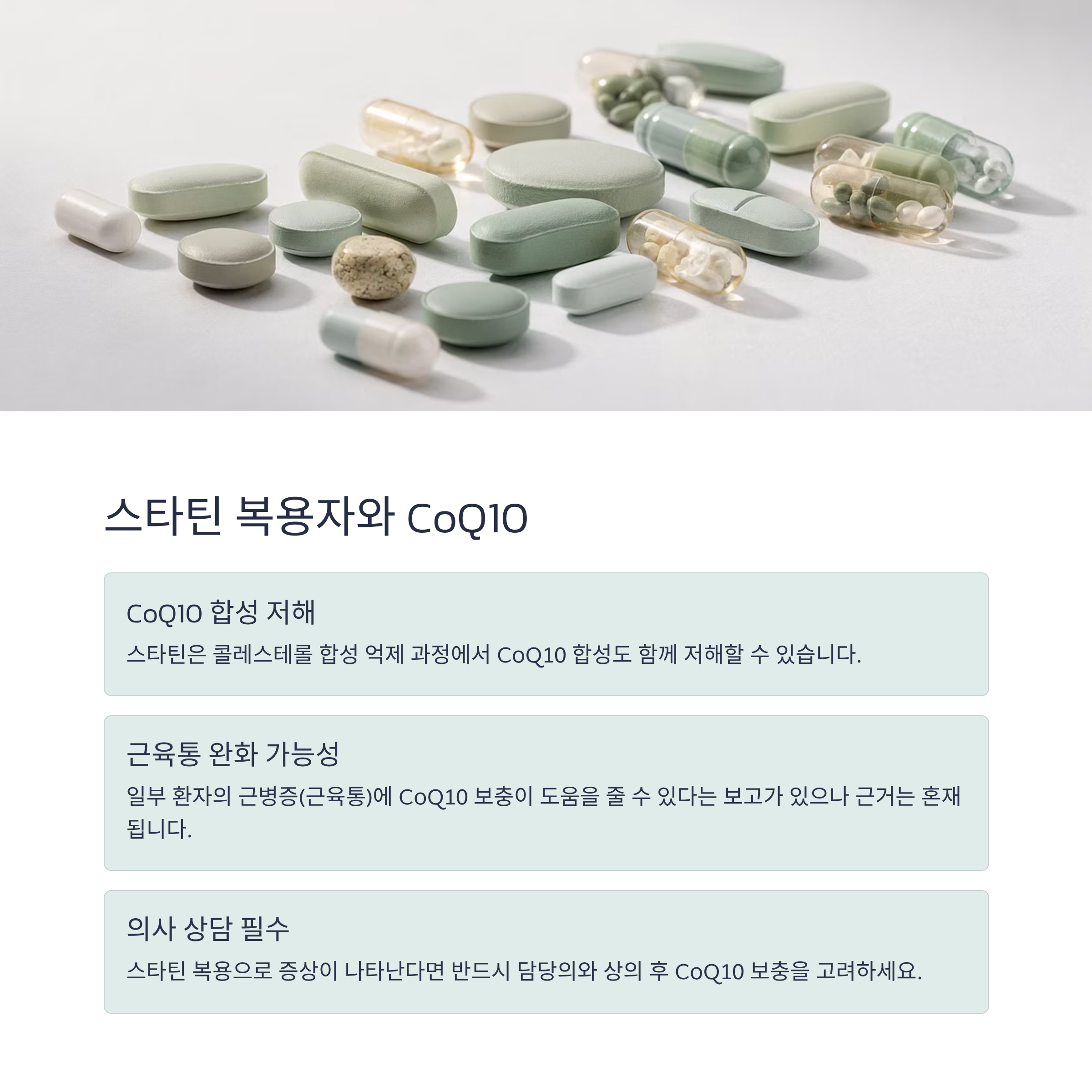 스타틴은 콜레스테롤 합성을 억제하는 과정에서 CoQ10 합성도 저해할 수 있습니다. 일부 환자에서는 근육통(근병증)을 호소하는데, CoQ10 보충이 통증 완화에 도움을 줄 수 있다는 보고들이 있으나 결과는 혼재되어 있어 결정적 근거는 부족합니다. 따라서 스타틴 복용으로 인한 증상이 나타난다면 담당의와 상의하여 CoQ10 보충을 고려하는 것이 바람직합니다.