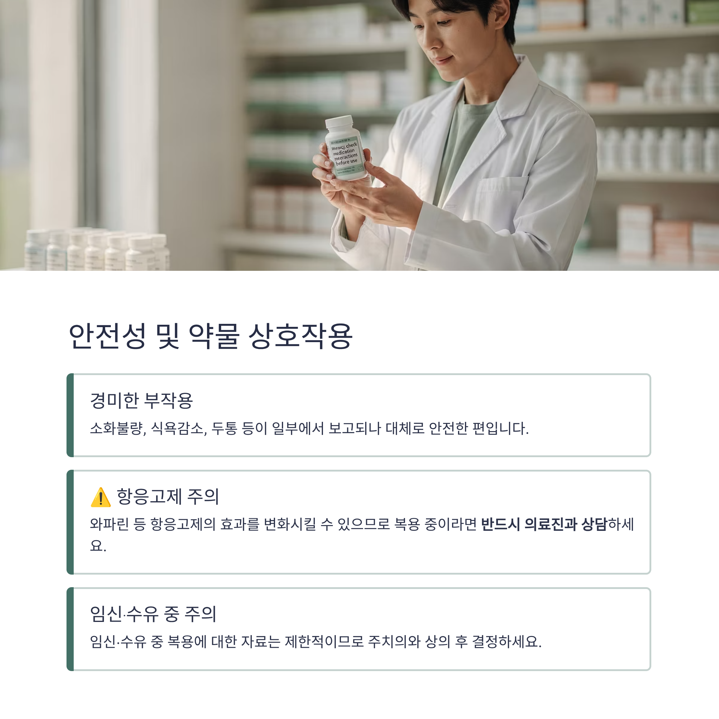 CoQ10은 대체로 안전한 편이나 일부에서 소화불량, 식욕감소, 두통 등의 경미한 부작용이 보고됩니다. 중요한 약물 상호작용으로는 항응고제(와파린 등)의 효과를 변화시킬 수 있으므로 항응고제를 복용 중이라면 반드시 의료진과 상담해야 합니다. 임신·수유 중 복용에 대한 자료는 제한적이므로 주치의와 상의하세요.