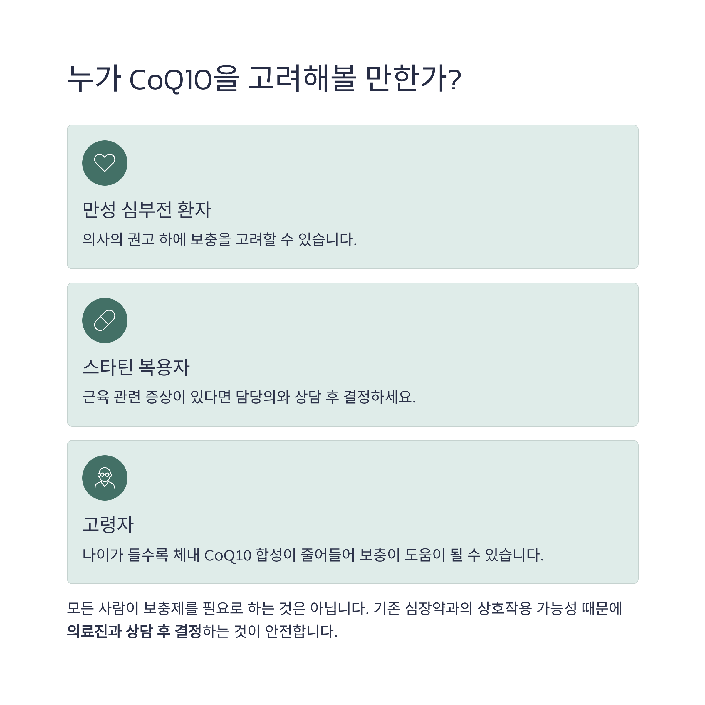 - 만성 심부전 환자(의사의 권고 하에) - 스타틴 복용으로 근육 관련 증상을 호소하는 환자(담당의와 상담) - 나이가 들어 체내 합성이 줄어든 고령자 그러나 모든 사람이 보충제를 필요로 하는 것은 아니며, 기존 심장약과의 상호작용 가능성 때문에 의료진과 상담 후 결정하는 것이 안전합니다.