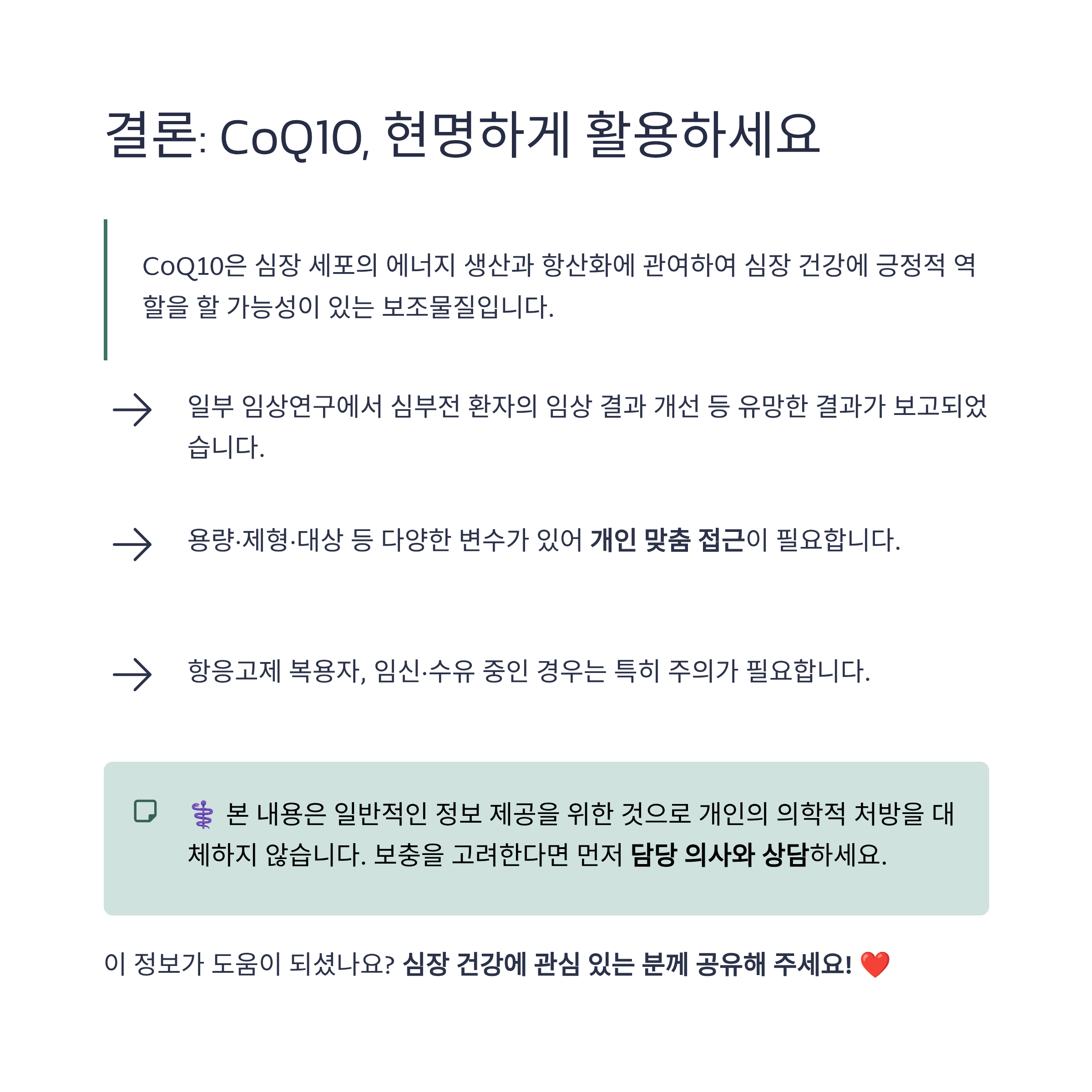 CoQ10은 심장 세포의 에너지 생산과 항산화에 관여하여 심장 건강에 긍정적 역할을 할 가능성이 있는 보조물질입니다. 일부 임상연구에서 심부전 환자의 임상 결과 개선 등 유망한 결과가 보고되었지만, 용량·제형·대상 등 다양한 변수가 있어 개인 맞춤 접근이 필요합니다. 보충을 고려한다면 먼저 담당 의사와 상담하고, 특히 항응고제 복용자나 임신·수유 중인 경우는 주의가 필요합니다.